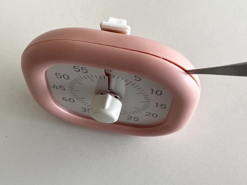 そのため、「タイマーが鳴らない!」とつまみをぐるぐると回して、0秒以下の方に回してしまうと、色フィルムが隙間に入り込み二度と色フィルムが戻ってこなくなってしまいます。